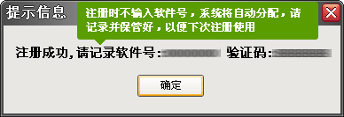 因為目前為測試階段,所以無需輸入軟件號和驗證碼,系統將自動分配一個,請記錄并保管好,以便下次再次注冊。