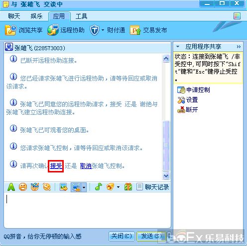 第三步:等待對(duì)方確認(rèn)后,點(diǎn)擊再次彈出的確認(rèn)對(duì)話框中的“接受”按鈕