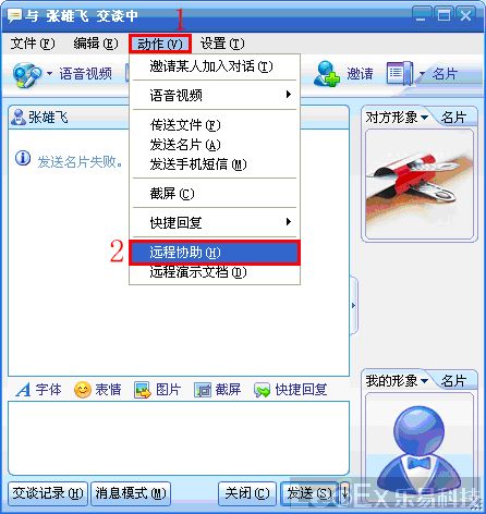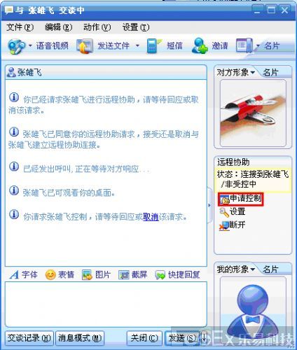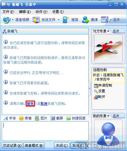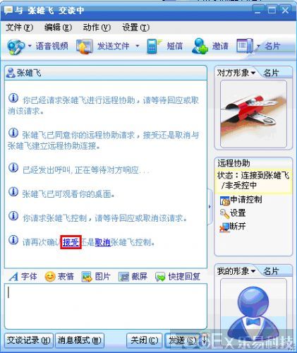 首先登陸TM,然后找到發送遠程協助的TM好友,雙擊該好友的TM頭像,打開聊天對話框,在對話框的正上方,有一排文字菜單,單擊其中的“應用”菜單,在顯示出來的子菜單中單擊“遠程協助”即向該好友發送了遠程協助的請求。 接下來只要等待對方確認,當對方接受遠程協助的請求后,TM會再次要求你確認是否接受對方為你遠程協助,點接受即可。 然后,當提示“某某某已可觀看您的桌面。”時,單擊聊天對話框右側的申請控制,等待對方確認后,再次點擊接受,即完成了整個遠程協助的發起,接下來就是該好友為你遠程協助處理問題。 流程圖如下: 第一步:啟動TM,并且找到需要發送遠程協助的好友TM,雙擊打開聊天對話框