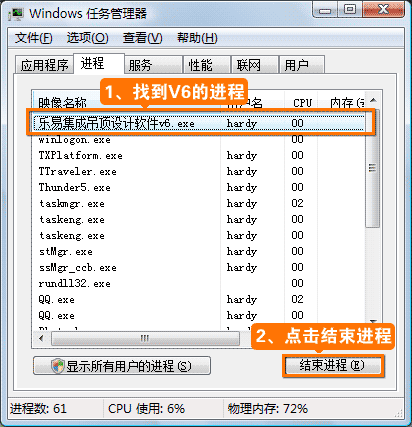 2、在打開的任務管理器中,選擇“進程”選項卡,選中其中的“樂易集成吊頂設計軟件V6.exe”,然后點擊“結束進程”即可。